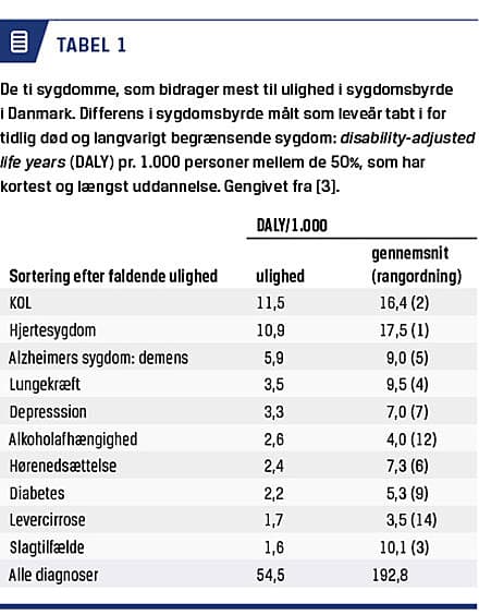 I Danmark er KOL den sygdom, som bidrager mest til social ulighed i sundhed, og er samtidig en af de sygdomme, som forårsager flest dårlige og tabte leveår (Tabel 1).