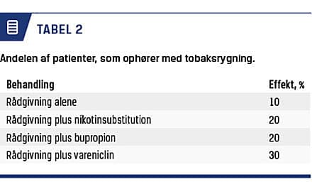 Det er veldokumenteret, at nikotinsubstitution (NRT), bupropion og vareniclin alle kan hjælpe til rygestop i kombination med rådgivning/rygestopkurser – med vareniclin som den mest effektive (Tabel 2) [13]. Ved at kombinere flere NRT (f.eks. plaster i kombination med tyggegummi) eller NRT med bupropion eller vareniclin kan effekten muligvis øges [14]. Alle behandlingerne er relativt bivirkningsfri – fraset sjælden forekomst af kramper ved bupropionbehandling.