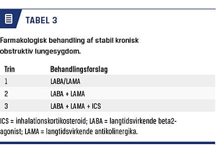 Enkelte patienter, specielt dem, der har både astma og KOL (ACO) med symptomer og/eller ≥ 1 årlig eks-acerbation/indlæggelse, kan indledningsvis behandles med LABA og ICS i lavest mulige effektive dosis. Trin 1 (LABA eller LAMA) gives til patienter med få symptomer og ingen eksacerbation/indlæggelse. Trin 2 (LABA og LAMA) gives til patienter med mange symptomer og/eller ≥ 1 årlig eksacerbation/indlæggelse. Trin 3 (LABA og LAMA og ICS) gives til patienter, der på trods af behandling med LABA og LAMA (eller LABA og ICS ved ACO) har fortsatte symptomer og/eller gentagne eksacerbationer/indlæggelser. Jo dårligere lungefunktion, jo større sandsynlighed for symptomer, inaktivitet og exacerbationer/indlæggelser.