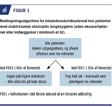 Hos patienter med stabil KOL (uden eksacerbationer eller indlæggelser på grund af KOL gennem mindst et år) kan man overveje ned- og/eller udtrapning i henhold til nedenstående og Figur 1 [21].