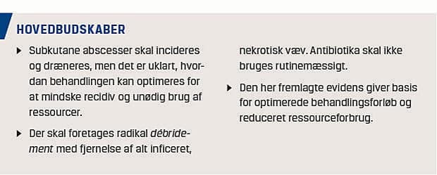 Vi har gennemgået og forholdt os til den tilgængelige evidens vedrørende behandling af simple subkutane abscesser. Det giver mulighed for, at man på de enkelte afdelinger kan optimere behandlingen af og reducere ressourceforbruget på denne hyppigt forekommende lidelse.