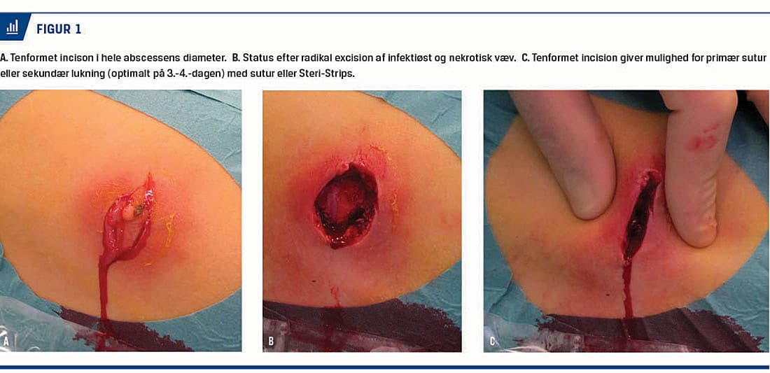Subkutane abscesser skal incideres og dræneres. Det kan hensigtsmæssigt ske gennem en længdegående eller tenformet incision (Figur 1A, B, C), som giver mulighed for primær sutur eller sekundær lukning. Der bør foretages radikal débridement med fjernelse af al pus, evt. abscesvæg og evt. nekroser i hud og underhud.