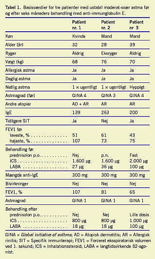 I denne opgørelse indgår der tre patienter, heraf en kvinde, med svær ustabil astma. Patienterne er gennem længere tid blevet fulgt og behandlet på lungemedicinske speciallægeambulatorier (Bispebjerg Hospital og Aalborg Sygehus) (Tabel 1). De havde atopisk sygdom med allergi over for flere aeroallergener, serum-IgE 139-263 kU/l, allergisk rinitis (n = 3) og atopisk dermatitis (n = 1). Alle havde daglige astmasymptomer, nogle havde hyppige natlige symptomer (n = 2), nedsat lungefunktion (n = 3) og reversibilitet eller peak flow-variation (n = 3), hvilket førte til klassifikation i henhold til globalinitiative of asthma (GINA) 3-4 trods behandlingen. Lungefunktionen udtrykt ved FEV1 var meget varierende (minimum: 43-61% prednisolon til maksimum: 73-107% prednisolon (Tabel 1)). Basisbehandlingen var moderat til høj dosis inhalationssteroid (ICS) (ICS: 800-2.500 mikrogram dagligt) kombineret med langtidsvirkende β2-agonist i en fixedcombination (FC) med ICS (FC-ICS/ LABA) (n = 3), korttidsvirkende β2-agonist (SABA) (n = 3), montelukast 10 mg × 1 (n = 3), nasalsteroid (n = 3) og antihistamin (n = 3). Behandling med systemisk prednisolon var hos nogle nødvendigt dagligt (n = 2) eller i kure af forskellig varighed (n = 1). Flere havde haft behov for skadestuebesøg (n = 3), indlæggelser (n = 3) og hyppige uanmeldte konsultationer (n = 3).