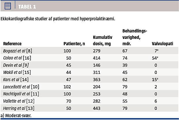Disse fund har medført en række tværsnitsundersøgelser (Tabel 1) med ekkokardiografisk vurdering af hjerteklapfunktionen hos cabergolinbehandlede patienter med hyperprolaktinæmi [8-16]. Sammenlagt drejer det sig om ca. 600 patienter, hos hvem der ikke samlet er påvist øget forekomst af klinisk signifikant valvulær regurgitation [17, 18], om end enkelte rapporterede om en højere forekomst af »mild regurgitation« [3, 14-16]. I et større internationalt, nested case-kontrol-studie fandt man øget risiko for klapfibrose hos patienter, som havde parkisonisme og var i behandling med cabergolin i mere end seks måneder, men ikke ved behandling med andre typer parkinsonismemedicin. I hyperprolaktinæmikohorten fandt man ingen association mellem behandling med dopaminagonister og udviklingen af hjerteklapfibrose [19].