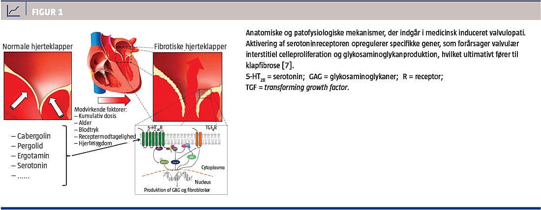Imidlertid er der i flere studier påvist en association mellem udviklingen af fibrotisk hjerteklapsygdom og behandling med højdosisdopaminagonister, først og fremmest cabergolin og pergolid, hos patienter med parkinsonisme [5, 6]. Den patogene mekanisme formodes at involvere binding af stofferne til serotonin (5-HT2B)-receptorer på hjerteklapperne, hvilket forårsager proliferation af fibromyoblaster, fibrose og dermed restriktiv hjerteklaplidelse [3] (Figur 1). Valvulært tilbageløb defineret som moderat til svær, og dermed behandlingskrævende, er blevet observeret hos ca. 25% af de patienter, som har parkinsonisme og er blevet behandlet med cabergolin (gennemsnitlig kumulativ dosis ca. 2.800 g) eller pergolid. Dette er en væsentligt højere forekomst end blandt patienter, som er blevet behandlet med andre typer parkisonismemedicin (0%), og i kontrolgruppen (5,6%] [6]. I et nested case-kontrol-studie med 11.427 patienter, som var blevet behandlet med anti-parkinsonismemedicin, fandt man i alt 31 patienter med fibrotisk klapsygdom, og hyppigheden var signifikant øget hos patienter, som var i behandling med pergolid (korrigeret IRR: 7,1; 95% konfidens-interval (KI): 2,3-22,3) og cabergolin (korrigeret IRR: 4,9; 95% KI: 1,5-15,6) [5].