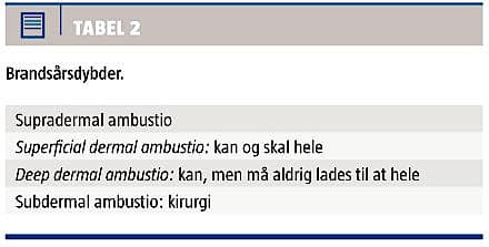 Der findes forskellige sværhedsgrader af brandsår, henholdsvis supradermal (1. grad), dermal (2. grad) og subdermal ambustio (3. grad) (Tabel 2). Det supradermale ambustio svarer til en solskoldning og involverer kun epidermis, hvorfor hudens barrierefunktion ikke er kompromitteret. Det dermale ambustio inddeles i en overfladisk og dyb dermal ambustio. Det overfladiske dermale ambustio involverer epidermis og øvre dermis og opheler på 10-14 dage uden nævneværdig ardannelse. Ved det dybe dermale ambustio involveres hele dermis inklusive de dermale papiller.