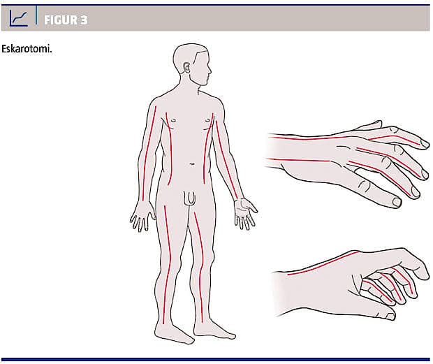 Hos patienter med symptomer på truende eller manifest brandsårsinduceret tourniquet er der indikation for eskarotomi. Der foretages incisioner til subcutis med skalpel, hvilket muliggør ekspansion af subcutis og dermed en dekompression af de underliggende strukturer [2]. Incisionen skal kun være til subcutis og ikke til fascieniveau; evt. kan man holde en finger på knivsbladet under udførelsen, så det begrænses, hvor dybt der incideres (Figur 2). Eskarotomier på thorax og abdomen anlægges langs den forreste aksillinje fra klavikelniveau til kurvaturen (Figur 3). Eventuelt anlægges der også en transversal incision anteriort på diafragmaniveau. Herefter vurderes effekten ved normalisering af blæretryk, diurese, blodtryk, respiration etc. På halsen anlægges eskarotomierne posteriort for sternokleiden for at undgå de større kar. På over- og underekstremiteterne anlægges de medialt og lateralt. På hånden anlægges de langs palmarfolden og på håndryggen mellem metacarpi. På fingrene anlægges de medialt og lateralt i neutrallinjen for at undgå sener, kar og nerver dorsalt og volart [2, 3] (Figur 3).