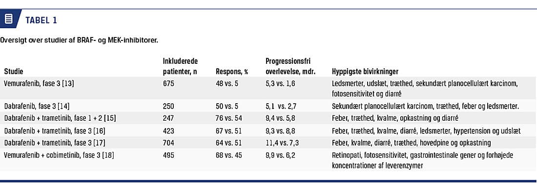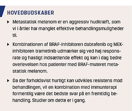 kan nu bruges i Danmark. Behandling med dabrafenib og vemurafenib udmærker sig ved høj responsrate og hurtigt indsættende effekt, om end den ofte er kortvarig pga. udvikling af resistens. Kombinationen af dabrafenib og trametinib er i Danmark første behandlingsvalg til patienter, der er testet positive for tilstedeværelse af BRAF V600-mutation og på diagnosetidspunktet har hastigt progredierende sygdom eller på anden måde ikke egner sig til immunterapi. I denne artikel vil vi gennemgå resultater fra kliniske studier med BRAF-inhibitorer som monoterapi og i kombination med MEK-inhibitorer, og vi vil diskutere årsager til, at der kan opstå resistens.