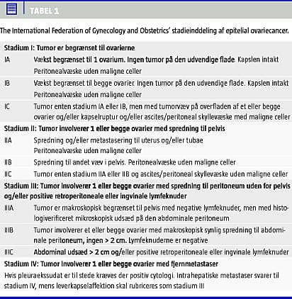 Ovariecancer inddeles i fire stadier (I-IV) (Tabel 1 ). De retroperitoneale lymfeknuders (LK) status har været elementær i stadieinddelingen siden 1987 [6]. Ovariecancer af den epiteliale type er den mest lymfofile af de gynækologiske cancere [7], og lymfatisk spredning ses ofte ved både tidlig og avanceret ovariecancer [8]. Lymfekar og kapillærer fra ovarierne samles i et subovarielt pleksus. Fra plekset findes tre drænageveje. Hoveddrænagen terminerer i de paraaortale LK mellem aortabifurkaturen og de renale arterier. Den anden vej løber langs de store ligamenter mod den laterale og posteriore pelvisvæg, hvor den terminerer i iliaca externa og obturator-LK. Herfra drænes lymfen til de paraaortale LK. Den tredje vej drænes til iliaca externa og ingvinale LK, som benævnes de pelvine LK [6].