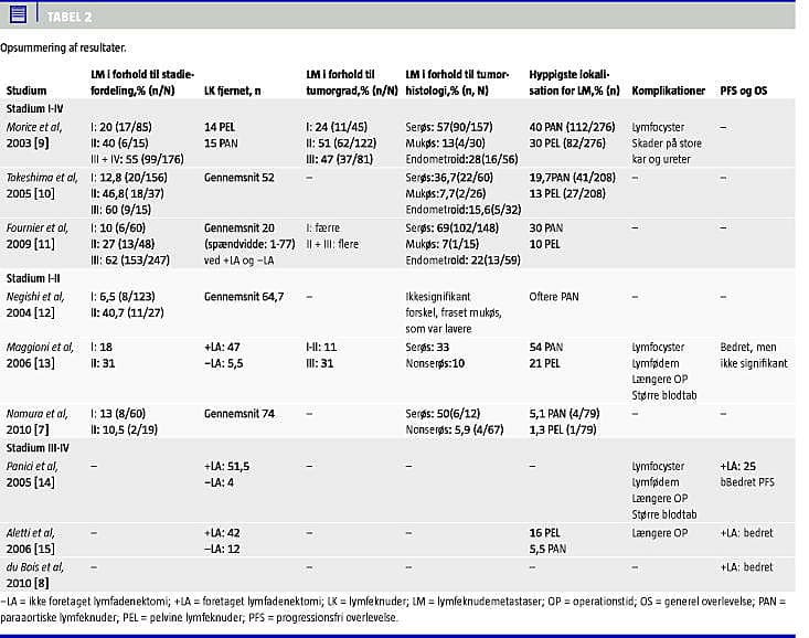 Morice et al [9] udførte lymfadenektomi hos 276 kvinder med epitelial ovariecancer. Der blev i gennemsnit fjernet 14 pelvine og 15 paraaortale LK. For den andel, som havde metastaser til LK, var fordelingen på stadier: stadium I 20%, stadium II 40%, stadium III + IV 55%. I forhold til tumorgrad var fordelingen: stadium I 24%, stadium II 51%, stadium III 47%. I forhold til histologisk type var fordelingen: serøse 57%, mukøse 13%, endometrioide 28%. Lymfeknudemetastaser (LM) fandtes hos 40% i de paraaortale LK og hos 30% i de pelvine LK. Hos 11% af kvinderne med stadium I-unilateral tumor fandtes der kontralaterale LM. Af de 229 kvinder, hos hvem der ikke blev fundet suspekte LK, havde 35% LM.