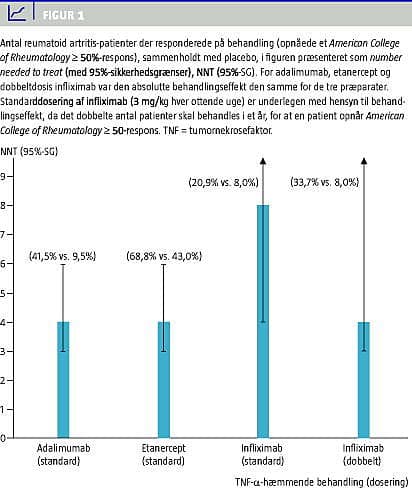 Ved opgørelse af de aktuelle forhold efter et års intervention med de eksisterende TNF-α-hæmmende behandlinger var andelen af patienter, der forblev i behandling: 159 (76,8%) på adalimumab, 193 (83,5%) på etanercept, 63 (73,3%) på standarddosering infliximab (3 mg/kg hver ottende uge) - slutteligt var der 66 (76,7%), der gennemførte intervention på infliximab dobbeltdosering (3 mg/kg hver fjerde uge). Med hensyn til det tilsvarende antal af patienter, der responderede på behandling (≥ ACR-50), sammenholdt med placebo: adalimumab 86 (41,5%) versus 19 (9,5%); atanercept 159 (68,8%) versus 98 (43,0%); infliximab (3 mg/kg hver ottende uge) 18 (20,9%) versus 7 (8,0%); hvor dobbelt dosis infliximab (3 mg/kg hver fjerde uge) medførte en responsrate på 29 (33,7%) patienter. Som det fremgår af Figur 1 , er disse tal ensbetydende med en ensartet klinisk effektstørrelse ved sammenligning af adalimumab, etanercept og dobbelt dosis infliximab, hvor henholdsvis fire (3-6), fire (3-6) og fire (3-11) patienter behøve behandling i et år for at opnå en »rask« (≥ ACR-50) patient. Til sammenligning var standarddosering af infliximab (3 mg/kg hver ottende uge) underlegen med hensyn til klinisk effekt, hvor otte (4-66) patienter behøver behandling i et år for at en patient bliver »rask«.
