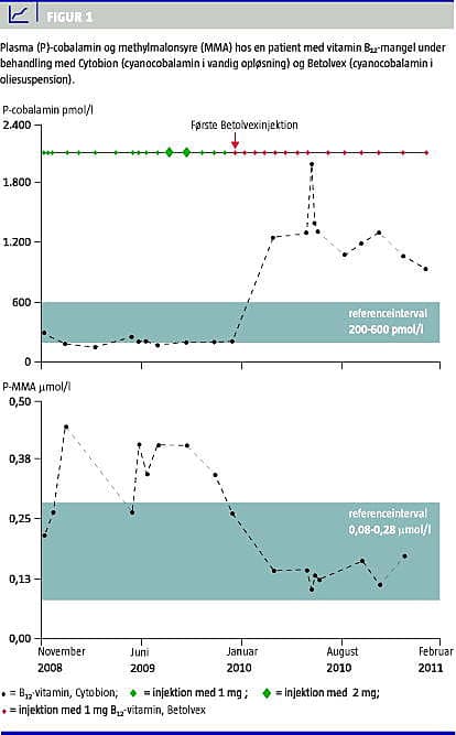 Efter hjemkomsten til Danmark udstedte patientens egen læge recept på Betolvex og igangsatte behandling med injektion hver uge i fire uger. Herefter var planen at fortsætte med injektioner hver tredje måned, men da kontrolblodprøver viste, at patienten ikke var optimalt behandlet, blev behandlingen intensiveret. I løbet af det efterfølgende år fik patienten injektion med B 12 -vitamin hver 3.-5. uge, et par gange med doser på 2 mg. Laboratorieprøverne viste i hele forløbet, at patienten ikke var optimalt behandlet vurderet ud fra plasmacyanocobalamin og methylmalonsyre (MMA) (Figur 1 ). Patientens egen læge valgte derfor at henvise ham til nærmere udredning på Hæmatologisk Afdeling, Aarhus Universitetshospital, på mistanke om tilgrundliggende malignitet. Der blev ikke påvist tegn på malign sygdom, men fund af let gastritis og parietalcelleantistoffer understøttede patientens B 12 -vitamin-mangel-sygdom. Da årsagen til det hyppige injektionsbehov fortsat var uafklaret, blev patienten henvist til Klinisk Biokemisk Afdeling, Aarhus Universitetshospital, til udredning af B 12 -vitamin-omsætningen. Her blev der fundet normale forhold for B 12 -vitamin-udskillelsen og for de B 12 -vitamin-bindende proteiner i plasma. Samtidig fandt man, at plasma-MMA var normaliseret, og plasmacobalaminniveauet var langt over referenceintervallet (Figur 1). Disse fund førte til en gennemgang af behandlingsforløbet: Patienten havde medbragt rigelige mængder af Cytobion til Danmark, og først da ampullerne slap op i december 2009, indløste patienten recept på Betolvex. Patienten var således blevet behandlet suboptimalt med for store intervaller med Cytobion i over et år før skift til Betolvex. Patienten blev efterfølgende behandlet med Betolvex med god effekt (Figur 1).