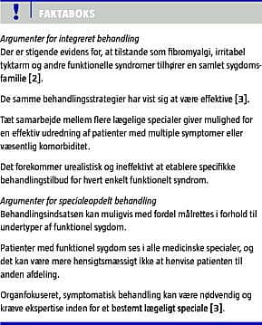 Nogle patienter med funktionel sygdom er så svært syge eller har et så komplekst sygdomsbillede, at de kræver en specialiseret behandlingsindsats enten i form af specifikke samarbejdsmodeller mellem almen praksis og specialafdeling eller som tværfaglig, multimodal behandling [3]. I Danmark kendes multimodal behandling fra enkelte smerteklinikker og rygcentre. De mest veldokumenterede isolerede behandlingselementer for funktionel sygdom omfatter dels farmakologisk behandling, der er rettet mod forstyrrelser i symptomperception og den centrale smertehæmning [11-14], dels fysisk genoptræning [15] og kognitiv adfærdsterapi [13, 14, 16]. Der er ligeledes en vis evidens for en kombination af disse behandlingselementer i en multimodal behandlingstilgang [17]. Aktuelt er det dog uklart, om multimodal behandling er mere effektiv end monofaglig specialistbehandling, ligesom den relative effekt af de enkelte interventioner ikke kendes. Det samme gælder nye behandlinger som f.eks. mindfulness-based stress reduction, sakralnervestimulation eller transkraniel magnetstimulation, hvis effekt på funktionel sygdom endnu er usikker.