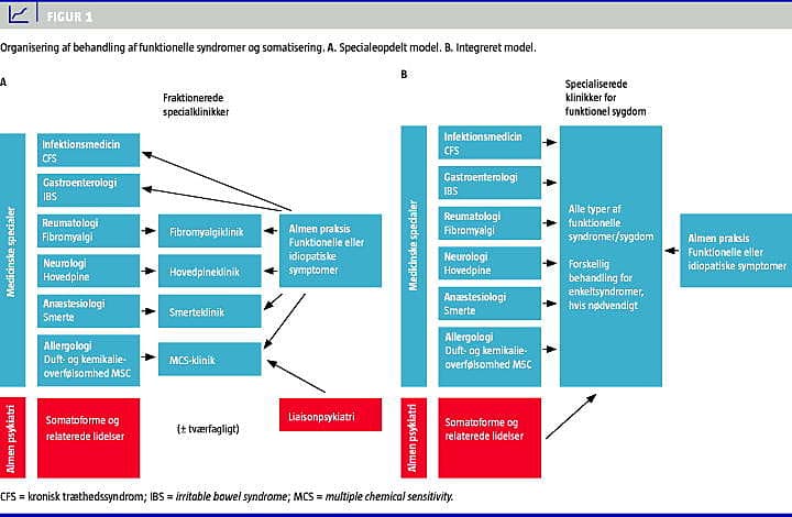 Overordnet kan tilbuddet til patienter med funktionelle symptomer og syndromer inddeles i a) forebyggelse, b) ikkespecialiseret behandling (f.eks. almen praksis), c) specialiseret behandling og d) rehabilitering. Den specialiserede behandling tilbydes dels i klinikker, hvor man har fokus på specifikke symptomer/syndromer (Figur 1A ), dels i klinikker hvor man behandler alle typer af funktionel sygdom (Figur 1B ). Klinikkerne kan have vidt forskellige behandlingsstrategier, og behandlingen kan være multidisciplinær eller monofaglig. Der er gode argumenter for både integreret og specialeopdelt behandling, men den integrerede tilgang synes at have flest fordele og får bred opbakning internationalt [3].