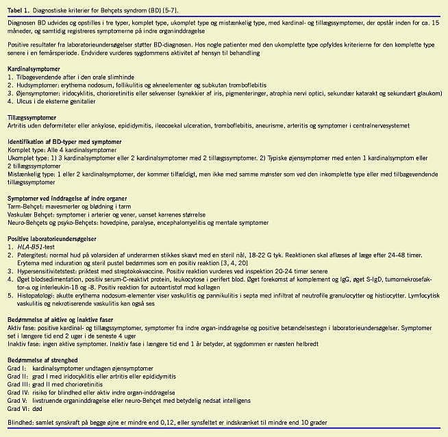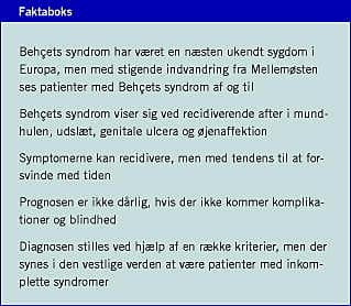 Behçets syndrom (BD) er et symptomkompleks, der omfatter orale after, udslæt, genital ulcus og øjensymptomer. Sygdommen ses oftest i Tyrkiet, de mellemøstlige lande, lande langs Silkevejen, Kina, Korea og Japan. Symptomkomplekset blev beskrevet af Hippokrates i det 5. århundrede og siden af Adamantiaddes i 1903 og af Behçet i 1937. Sygdommen er kendt under navnet Adamantiaddes-Behçets syndrom eller BD [1, 2]. I 1966 blev der holdt et symposium om BD i München [2], hvilket bidrog til øget opmærksomhed om sygdommen. I 1990 dannedes den internationale studiegruppe, der tentativt præsenterede de kliniske kriterier for diagnosen BD, baseret på tidligere erfaringer [3]. Dog har ethvert land modificeret kriterierne. Den måde, sygdommen viser sig på, er ændret med årene, og flere patienter opfylder ikke de diagnostiske kriterier fuldt ud [4-6]. Blandt nyere forskningsresultater er relationen af BD med HLA-51- genet og Streptococcus sanguinis i mundhulen af betydning for diagnose og behandling. I 2005 præsenterede en japansk studiegruppe et sæt udvidede diagnostiske kriterier, der var tilpasset de nuværende sygdomsudtryk, og studiegruppen gav også råd om behandling [4-7]. BD er sjælden i de nordiske lande, men den øgede forbindelse med mellemøstlige lande medfører sandsynligvis et stigende antal af BD- og BD-suspekte patienter. Vi bør derfor genopfriske og forny vores viden om BD.