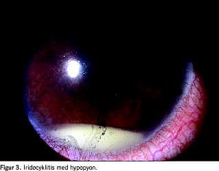 90% af patienterne har symptomer i øjnene i form af uveitis anterior (iridocyklitis) efter aftøs stomatitis. Hos 10% af patienterne begynder BD i øjnene uden after. Patienterne klager over sløret syn, smerte, fotofobi, tåreflåd, glaslegemeuklarhed og peribulbær hyperæmi. Hypopyon i forreste kammer er karakteristisk for anterior uveitis (Figur 3 ).