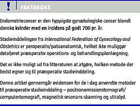Vi vil i denne oversigtsartikel forsøge at belyse den nyeste evidens inden for præoperativ stadieinddeling af endometriecancer med fokus på positronemissionstomografi/computertomografi (PET/CT), magnetisk resonans (MR)-skanning og ultralyd.