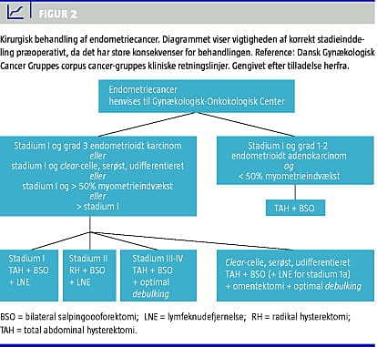 I 1988 ændrede International Federation of Gynecology and Obstetrics (FIGO) den kirurgiske stadieinddeling af endometriecancer til at inkludere pelvin og paraaortal lymfeknudefjernelse, da lymfeknudestatus er en af de vigtigste prognostiske faktorer for patienten [3]. Operationens omfang vurderes dels ved præoperative undersøgelser og dels ved makroskopisk vurdering af cancernedvækst i myometriet, eller gennemvækst (Figur 1 ) og spredning i det lille bækken og øvrige abdomen. Proceduren er insufficient og uhensigtsmæssig, da behandlingen først afgøres peroperativt, og det endelige stadie først bestemmes postoperativt ved patologens undersøgelse af operationspræparat og lymfeknuder [4].