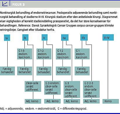 Dansk Gynækologisk Cancer Gruppes (DGCG's) nyeste retningslinjer for kirurgisk og nonkirurgisk behandling fremgår af Figur 2 og Figur 3 . Figurerne viser vigtigheden af korrekt stadieinddeling præoperativt, da det har store konsekvenser for behandlingen.