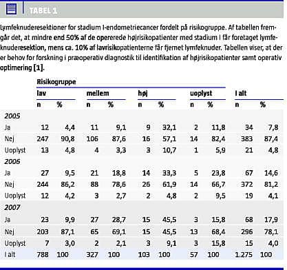 Rutinemæssig fjernelse af lymfeknuder med henblik på stadieinddeling er i flere undersøgelser fundet uhensigtsmæssig, da proceduren kan have betydelige bivirkninger og ikke har overlevelsesmæssig konsekvens i de tidlige stadier [5]. I Danmark får mindre end 50% af mellem- og højrisikopatienterne i stadie I foretaget en anbefalet lymfeknuderesektion, mens 10% af lavrisikopatienterne får foretaget en unødvendig resektion (Tabel 1 ). Sidstnævnte kan skyldes usikkerhed ved den præ- og peroperative vurdering af cancerens spredning. Der er derfor et stort behov for forskning i bedre diagnostiske metoder til at differentiere mellem patienter, der kan nøjes med simpel operation, og de der har behov for større operation med lymfeknudefjernelse [1].