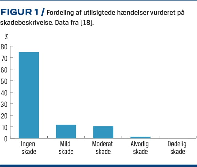 Der findes kun få danske undersøgelser på området, men et udtræk fra Dansk Patientsikkerhedsdatabase (2010-2014) understøtter tallene fra udlandet. I denne undersøgelse beskrev man UTH blandt hospitaliserede børn [18] og fandt, at i alt 2.071 UTH var relateret til medicinering. Heraf var der associeret varierende grader af skade hos 23,5%, hvilket svarer til 487 UTH (Figur 1). Omkring halvdelen af de opgjorte UTH var doseringsfejl [18], der også var den hyppigste årsag til alvorlig skade. Årsagerne til doseringsfejl var primært ordinationsfejl (41%) og dispenseringsfejl (39%). Underrapportering er dog sandsynlig [9, 15]. Det er uvist, om fordelingen af hændelser ville være anderledes, hvis de ikkerapporterede hændelser blev inkluderet.