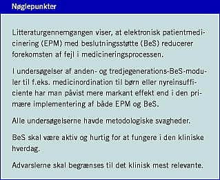EPM med BeS reducerer forekomsten af fejl i medicineringsprocessen i forhold til manuel medicinordination. Mest markante resultater ses ved indførelse af BeS, der tillægges i for-vejen eksisterende EPM-systemer, f.eks. BeS til antibiotika-ordination og ordination til nyreinsufficiente eller til børn (Tabel 1).