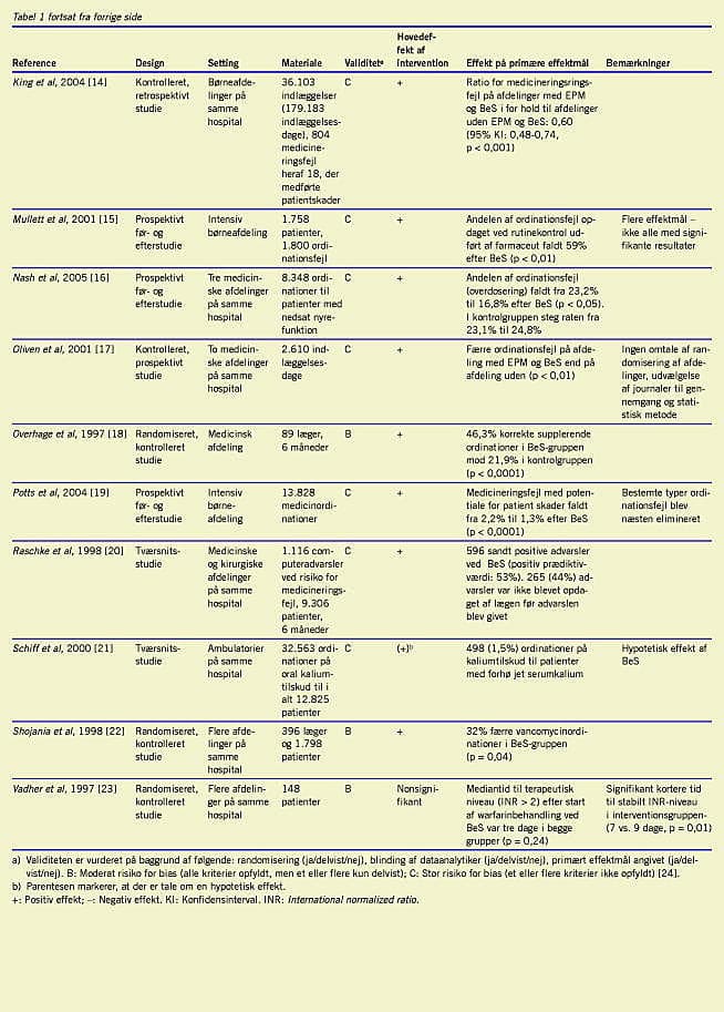 I overensstemmelse med vores fund af reduktion i forekomsten af medicineringsfejl med BeS påvises der i et Coch-rane-review [25] positiv effekt af BeS på flere effektparametre ved ordination af præparater med et snævert terapeutisk indeks: Dosering vha. BeS medførte færre bivirkninger i forhold til manuel dosisberegning, færre patienter opnåede toksisk lægemiddelniveau, indlæggelsestiden var signifikant reduceret, og man nåede hurtigere det terapeutiske niveau. Der var en tendens til, at patienter doseret med BeS modtog højere doser af lægemidler. Undersø gelsen inddrog ikke medicineringsfejl som effektparameter.
