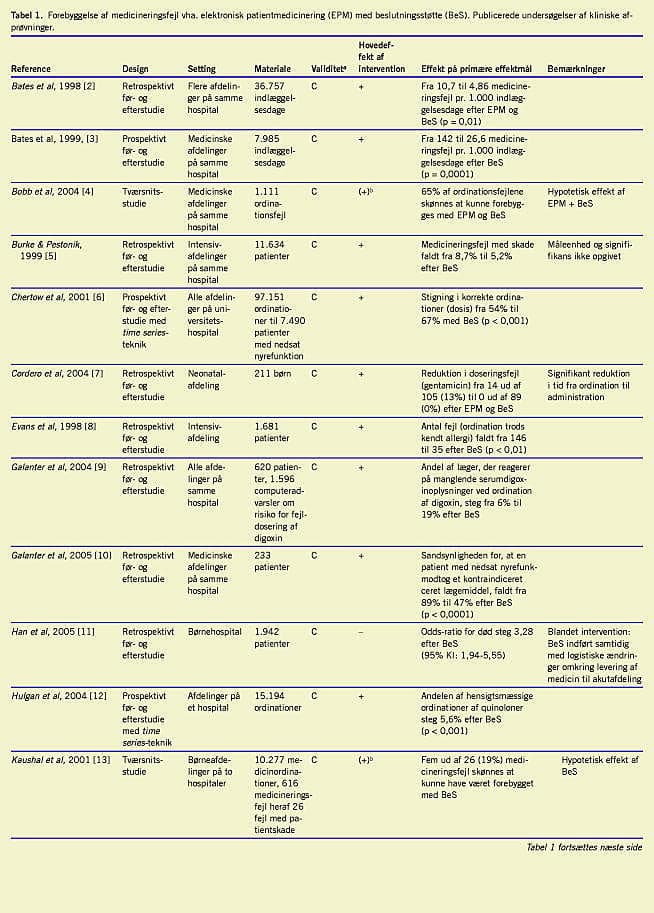 I nærværende artikel gennemgås kliniske afprøvninger af beslutningsstøtte (BeS) til elektronisk patientmedicinering (EPM) i relation til forekomsten af medicineringsfejl. Toogtyve artikler opfyldte kriterierne. Heraf viste 21, at EPM med BeS reducerer forekomsten af medicineringsfejl. Effekten var mest markant for anden- og tredjegeneration af BeS. Alle undersøgelserne havde metodologiske svagheder. EPM med BeS giver et øget tidsforbrug og mulighed for generering af nye fejl. Der findes endnu ikke et dansk datagrundlag for BeS.