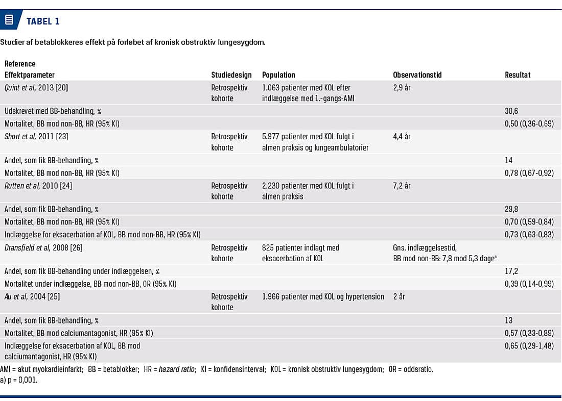 Resultater af en række af observationelle studier tyder på, at brug af betablokkere ved KOL kan være associeret til en bedre prognose (Tabel 1). I studiet af Quint et al [20], blev næsten 1.100 patienter med KOL observeret i tre år efter indlæggelse med førstegangsmyokardieinfarkt. Efter justering for lungefunktion og kardiovaskulære risikofaktorer som alder, køn og rygestatus m.m. fandt man en signifikant reduceret mortalitet på 50% blandt de patienter, som havde KOL og fik betablokkerbehandling ved udskrivelsen.