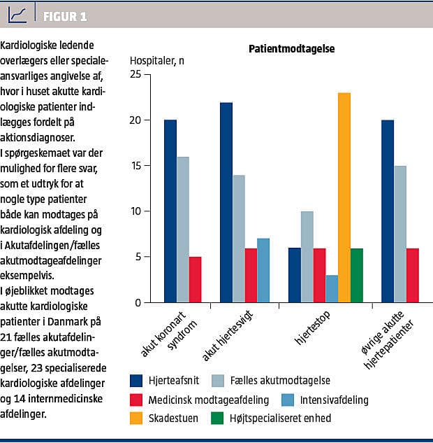 Antallet af afdelinger, der modtager akutte kardiologiske patienter i Danmark, er i øjeblikket 37. I DCS’ enquete 2012 opnåede man en svarprocent på 95 (n = 35). Der modtages hjertepatienter på 23 specialiserede kardiologiske afdelinger og 14 internmedicinske afdelinger. Derudover modtages der kardiologiske patienter på 21 fællesakutmodtagelser, som er defineret af SST [1, 4], samt en række medicinske modtageafsnit og skadestuer.