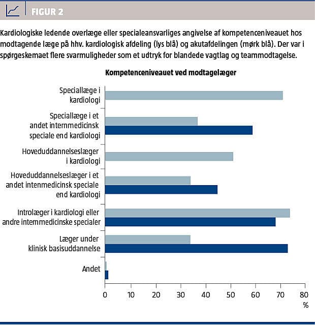 Kompetencerne hos de modtagende læger afhænger af, om patienten modtages på akutafdelingen eller på et kardiologisk afsnit. På akutafdelingen bliver patienten oftest modtaget af en læge i klinisk basisuddannelse eller introduktionsstilling. Hvis patienten derimod visiteres direkte til et kardiologisk afsnit, vil vedkommende oftest blive modtaget af en læge i introduktions- eller hoveduddannelsesstilling i kardiologi (Figur 2). Af DCS’ enquete 2012 fremgår det, at en kardiologisk speciallæge deltager i indlæggelserne på 25 af de 35 (71%) adspurgte kardiologiske afdelinger, hvorimod en speciallæge i et andet grenspeciale deltager ved indlæggelsen på 13 af de 21 (59%) fælles akutafdelinger (Figur 2).