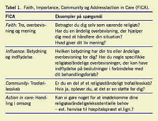 Det må betragtes som uafklaret, i hvor stor udstrækning danske patienter oplever religiøse/eksistentielle behov, og hvorvidt sådanne ønskes imødekommet. Samtidig kan en sundhedsfaglig samtale om eksistentielle behov tænkes at blive oplevet som særlig udfordrende i et sekulært samfund som det danske, hvor religiøs eller åndelig overbevisning generelt betragtes som et privat anliggende. Der foreligger en række redskaber, der er udviklet til udforskning af patientens religiøse/åndelige baggrund og kan anvendes i sammenhæng med vurdering af andre forhold, f.eks. familiær/social baggrund [10]. Faith, Importance, Community og Address/action in Care (FICA), som er beskrevet i Tabel 1 , er et af de hyppigst anvendte i USA. Der er imidlertid brug for undersøgelser af, om der er brug for sådanne kommunikationsredskaber i dansk klinisk praksis, og i bekræftende fald om de fungerer tilfredsstillende eller skal tilpasses danske forhold.