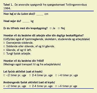 Materiale og metoder: I alt 15.252 kvinder og 14.181 mænd født i 1953-1982 fra Det Danske Tvillingeregister svarede på et spørgeskema i 1994. Spørgsmål udvalgt fra spørgeskemaet omhandlede sygdomme, vægt, højde, fysisk aktivitet og tilfredshed med kropsbygningen. Univariate analyser blev udført med χ 2 -test og t-test. Multivariatanalyse blev lavet med logistisk regression.