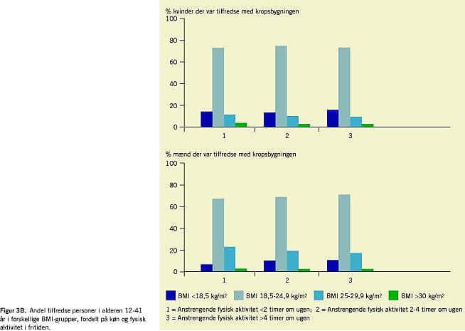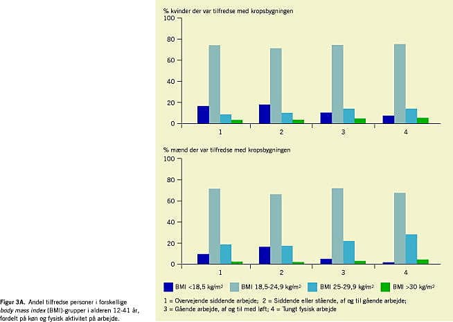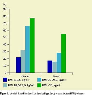 Blandt mændene var 81% tilfredse med deres kropsbygning, mens det samme gjaldt for 65% af kvinderne, χ22d.f· = 114,73, p < 0,0001. Der var dobbelt så mange mænd (20,3%) som kvinder (10,3%) med et BMI > 24,9 vurderet på baggrund af deres besvarelse af spørgeskemaet.