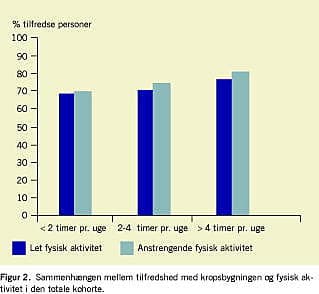 Der var en sammenhæng mellem tung fysisk aktivitet i arbejdssammenhæng og kropstilfredshed og ligeledes mellem kropstilfredshed og fysisk aktivitet i fritiden hos både mænd og kvinder, således at der var flest, der var tilfredse blandt dem, der udviste mest fysisk aktivitet. For tung fysisk aktivitet i fritiden var dette dog mere udtalt hos mændene (Figur 2 ).