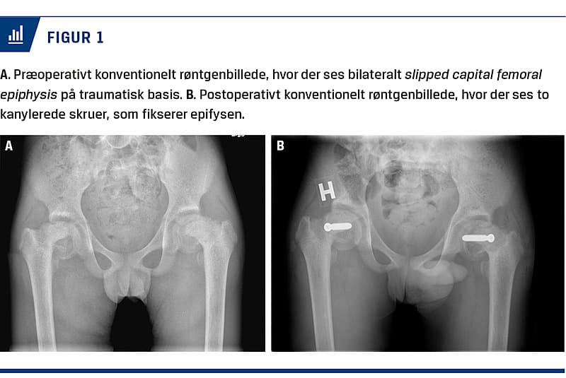 Ved den kliniske undersøgelse lokaliseredes der smerter i hoften. En røntgenundersøgelse viste bilateral SCFE, som syntes at være af ældre dato (Figur 1A). Differentialdiagnostisk overvejede man nontraumatisk SCFE, men da patienten ikke havde de klassiske disponerende faktorer, og der var sammenfald med de epileptiske anfald, vurderede man, at traumatisk SCFE pga. epileptiske anfald var den mest sandsynlige diagnose.