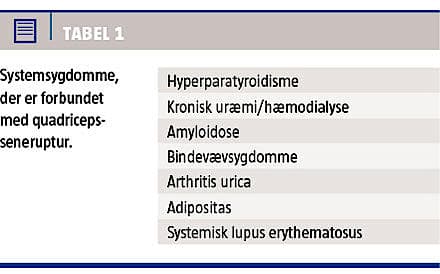 Bilateral quadricepsseneruptur (BQTR) er en sjælden diagnose, der kun er beskrevet i ca. 100 tilfælde i den internationale litteratur, oftest som sygehistorier [1]. Tilstanden er forbundet med overvægt, traume med ekstension af knæleddet mod maksimal kraft, systemsygdomme (Tabel 1) eller medicinbrug, oftest steroidpræparater. I enkelte sygehistorier har man haft mistanke om statinbehandling som en risikofaktor