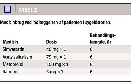 Fraset et tidligere akut myokardieinfarkt havde patienten ingen kendte sygdomme, og han havde ikke været i behandling med systemisk eller lokal steroid. Han var adipøs med et body mass index på 30,1 kg/m2 og aktiv ryger. Siden sit akutte myokardieinfarkt havde han bl.a. været i behandling med statin i standarddosis (Tabel 2).