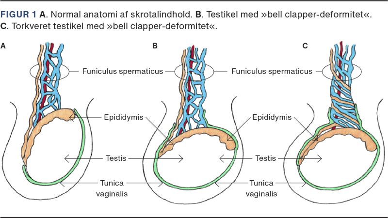 bimodal incidens med »peaks« i neonatallivet, hvor der oftest findes ekstravaginal TT, og peripubertært med intravaginal TT [1, 2, 5]. Prædisponerende faktorer til intravaginal TT er bl.a. testikulær vækst og BCD [3-5]. Ved BCD indeholder tunica vaginalis hele testiklen, bitestiklen samt en del af funiculus spermaticus, hvilket giver testiklen mere frihed til at dreje om egen akse (Figur 1). Tilstanden ses oftest bilateralt [4, 5]. BCD er associeret med en lavere risiko for orkiektomi sammenlignet med TT uden BCD, da BCD sandsynligvis tillader en højere grad af torsion før total arteriel okklusion [2]. Klinisk kan dette formentlig vise sig som fravær af smerter samt sparsomme eller ingen objektive fund. Dette kan være en diagnostisk udfordring, som tydeliggøres i denne case, hvor patienten havde snigende unilateral smertedebut og med kraftig forværring efter 11 timer, på trods af at man operativt fandt bilateral TT.