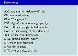 Summary Imaging of the Pathophysiology in Acute Stroke Ugeskr Læger 2007;169(40):3369-3372 Recent developments in neuroimaging have changed the diagnostic aspect of acute stroke and improved our understanding of stroke pathophysiology. Both diffusion weighted MR imaging and CT are capable of detecting the infarcted volume damaged by cytotoxic edema. However, within six hours of stroke onset, DWI has both higher sensitivity and specificity than CT. Perfusion weighted MR imaging and perfusion CT can identify the tissue at risk surrounding the core of the infarct. CT and MR-angiography contribute important information concerning the intra and extracerebral arteries.