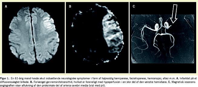 Ved perfusionsvægtet MRI optager man under bolusinjektion af et gadoliniumholdigt kontraststof en række hurtige T2* eller T2-vægtede billeder. Herved følger man kontrastmolekylernes passage gennem det cerebrale karnetværk. Ved matematisk bearbejdning af disse billeder kan man generere en række mål for blodgennemstrømningen [8]: cerebralt blodflow (CBF), cerebralt blodvolumen (CBV) og gennemsnitstransittid (MTT). Hos patienter med apopleksi medfører blodproppen i den tilførende arterie en forsinket passage gennem det ramte område (forlænget MTT), som fremstår hyperintenst (hvidt) på et MTT-billede ( Figur 1B ). Ved hjælp af en perfusionsvægtet billeddannelse (PWI) finder man hos den akutte patient ofte en PWI-læsion (område med forlænget MTT), som er større end den iskæmiske kerne på DWI. Forskellen betegnes som en PWI-DWI -mismatch og antages at afspejle den isk-æmiske penumbra. Ved at bedømme disse billeder kan radiologen danne sig et indtryk af, hvor meget væv der potentielt kan reddes.