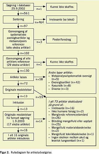 Vi inkluderede 13 originale meddelelser, og ved søgning for perioden 26. september 2002-1. september 2003 blev der fundet yderligere tre. Nedenstående gennemgang bygger således på de 16 originalarbejder, som fremgår af Tabel 1 og Figur 2.