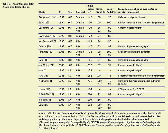 Vi søgte i PubMed, EMBASE og Cochrane Library med følgende søgeord: 1) Pulmonary embolism AND CT AND pulmon-ary angiography , 2) pulmonary embolism AND scintigraphy AND pulmonary angiography samt 3) pulmonary embolism AND echocardiography AND pulmonary angiography . Søgningen blev i PubMed og EMBASE begrænset til engelsksprogede artikler, i PubMed desuden til studier med mennesker. Søgningerne omfattede tidsrummet fra 1984 og frem til den 25. september 2002, og alle typer artikler blev medtaget.