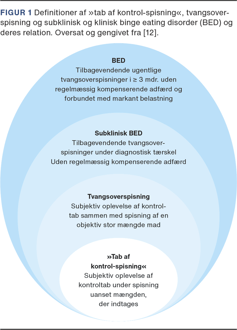 Diagnosekriterierne for børn og unge er de samme som for voksne. Der bør dog lægges større vægt på kontroltabsfølelsen i forbindelse med overspisningen frem for mængden af mad [9]. Dels fordi definitionen af en stor mængde mad varierer i denne aldersgruppe på grund af forskelle i kropsstørrelse, madbehov og periodevise vækstspurte, og dels fordi børn og unge har begrænset adgang til mad og indkøb [10, 11]. Derfor bruges ofte begrebet »tab af kontrol-spisning« (loss of control eating) for børn og unge, hvilket f.eks. kan komme til udtryk ved, at de spiser en mindre mængde af mange forskellige madvarer i hjemmet for at undgå, at spisningen opdages af forældrene. »Tab af kontrol-spisning«, hvor der ikke nødvendigvis spises en stor, men en anderledes mængde mad, kan også forekomme hos voksne og inkluderes i ICD-11-definitionen af tvangsoverspisning som alternativt kriterie til den store madmængde [7]. Se Figur 1 for en visualisering af forholdet mellem »tab af kontrol-spisning«, tvangsoverspisning, subklinisk BED og BED.
