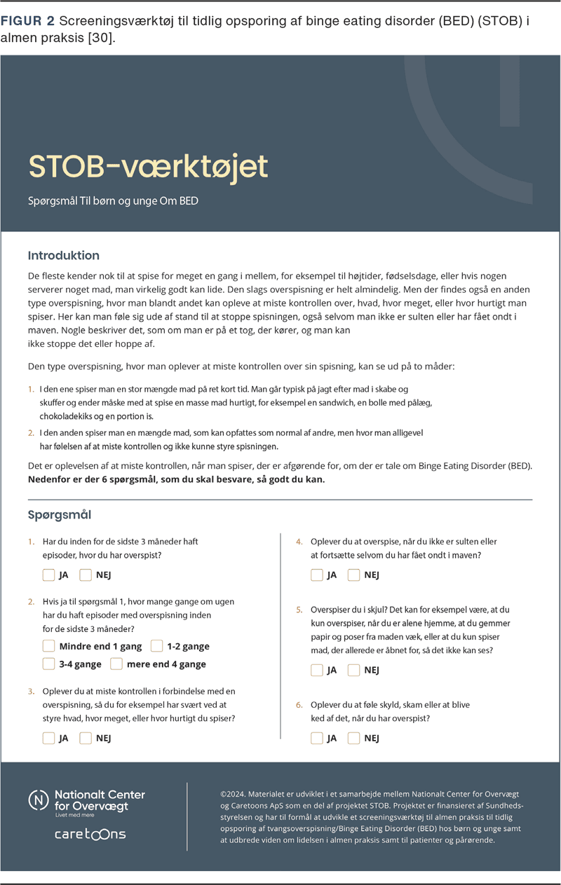 Det er afgørende for patientgruppen med BED, at sundhedsprofessionelle bliver bedre til tidligt at opspore og behandle deres lidelse. Til dette formål er der for nylig udviklet et kortfattet dansk screeningsværktøj, som er målrettet unge 13-18-årige. Screeningsværktøj til tidlig opsporing af BED i almen praksis (STOB) er udarbejdet til brug hos praktiserende læger, men kan også bruges af andre sundhedsprofessionelle. Værktøjet består af seks spørgsmål, som besvares hjemme eller ved egen læge (se Figur 2). Derudover medfølger et kort dialogværktøj, som praktiserende læger kan bruge i forbindelse med den indledende eller opfølgende samtale [30]. Screenings- og dialogværktøjet er udarbejdet med sparring fra praktiserende læger samt unge i målgruppen og er undersøgt for sin umiddelbare validitet med gode resultater [10].