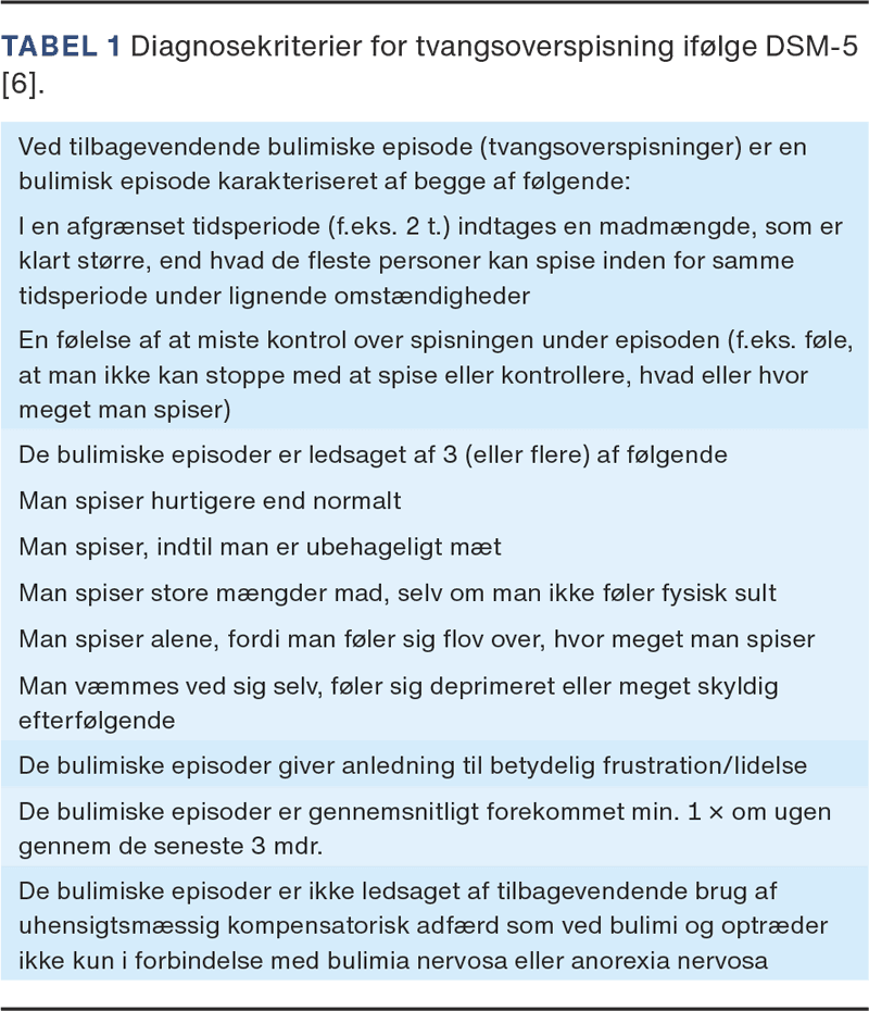BED er ifølge det amerikanske diagnosesystem DSM-5 og det kommende ICD-11 en spiseforstyrrelse på lige fod med anoreksi og bulimi [6, 7]. Ved både anoreksi og bulimi ses et forstyrret forhold til krop eller vægt, f.eks. i form af forvrænget kropsopfattelse, eller at vægt og figur har en overdreven betydning for selvopfattelsen. Derudover er kernesymptomet ved anoreksi selvpåført lav kropsvægt, mens kernesymptomerne ved bulimi er tilbagevendende tvangsoverspisninger (defineret nedenfor) og efterfølgende kompenserende adfærd (f.eks. selvfremkaldt opkastning eller ekstrem faste) for at forhindre vægtøgning.