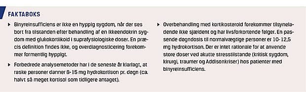 En række sygdomme [1] medfører nedsat sekretion af glukokortikosteroid. Det kan være lidelser i binyrerne (primær binyrebarkinsufficiens: Addisons sygdom) eller forstyrrelse i den hypotalamiske-pituitære regulering af binyrefunktionen (sekundær binyreinsufficiens). Den hyppigste form for sekundær insufficiens udvikles under steroidbehandling med farmakologiske doser for en nonendokrin sygdom. I en nyligt publiceret metaanalyse konkluderedes det, at der hos ca. 25% af 3.756 patienter efter glukokortikoidbehandling udvikledes langvarig binyreinsufficiens – hyppigheden tiltog med stigende steroiddosis og behandlingsvarighed [2]. De 25% må formodes at være et overestimat (i nogle af studierne anvendte man diagnostiske metoder, der ikke er pålidelige). Kun 1,9% af patienterne havde kliniske tegn på kortisolmangel.
