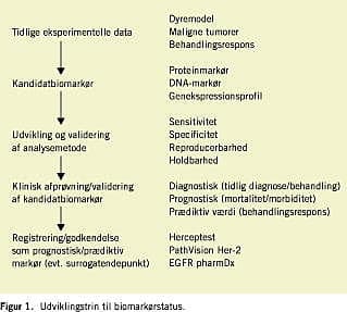 De fremtidige anvendelsesmuligheder for biomarkører er for tiden tydeligst som prædiktive markører for et positivt behandlingsrespons hos en undergruppe af en sygdom. Erfaringerne med biomarkørbaseret sygdomsinddeling er størst inden for onkologien, hvor østrogen- og testosteronreceptorindholdet i årtier har været anvendt i klassificeringen af brystkræft og prostatakræft til behandling med antihormoner. I de senere år er flere antineoplastiske lægemidler blevet hurtigt indregistreret (FDA: accelerated approval og orphan drug-status ) ved hjælp af en valideret sygdomsinddeling baseret på målinger af tumorbiomarkører. Disse lægemidler: trastuzumab, cetuximab og imatinib mesilate er meget omtalt som positive eksempler på anvendeligheden af biomarkører i lægemiddeludvikling. De skal også omtales her, fordi de samtidig er gode eksempler på biomarkørvalidering (Figur 1 ).