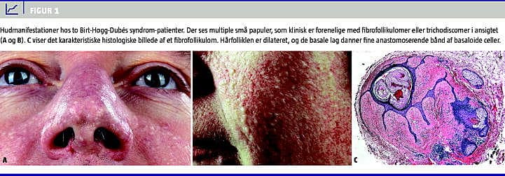 Birt-Hogg-Dubé (BHD) er en genodermatose, som blev beskrevet i 1977 af lægerne Birt, Hogg & Dubé , som således lagde navn til syndromet [1]. De beskrev hårfollikkel-hudtumorer, de såkaldte fibrofollikulomer (Figur 1 ), hos 15 individer af en familie på 70. Efterfølgende viste det sig, at hudtumorerne allerede var beskrevet i 1975 af lægerne Hornstein & Knickenberg [2], men da var BHD-syndromet allerede navngivet. Det har siden vist sig, at BHD-patienter også udvikler lungecyster, spontan pneumothorax og nyretumorer [3]. Selv om BHD er en sjælden sygdom, er viden om syndromet vigtig for at disse patienter genkendes og tilbydes deltagelse i et klinisk screeningsprogram.