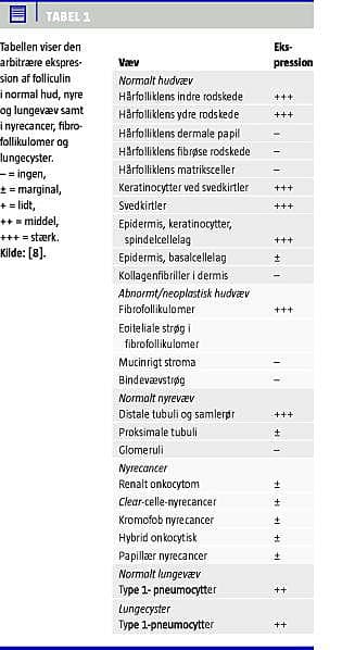 Der er fundet ekspression af FLCN-mRNA i huden, nyrerne, lungerne, pankreas, glandula parotis, mammae, prostata, lymfoidt væv og i hjernen [8]. Derimod synes FLCN bl.a. ikke udtrykt i hjertet, mukøse kirtler, muskelvæv og lever. Tabel 1 viser FLCN-ekspressionen i de væv, hvor de symptomatiske forandringer sker. Det interessante er, at udviklingen af nyretumorer er forbundet med tab af FLCN-ekspression, mens der stadig findes FLCN-ekspression i de kutane hamartomer og i lungecysterne. Dermed synes haploinsufficiens alene at kunne disponere til forandringer i hud og lunger [8]. Det bør dog verificeres i andre studier, før en endelig konklusion kan drages.